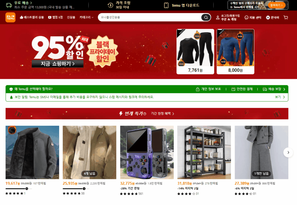 Temu는 다양한 카테고리의 제품을 저렴한 가격에 제공하며 글로벌 쇼핑 경험을 지원하는 온라인 쇼핑몰입니다.