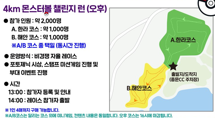 • 코스 거리: 4km (몬스터볼 챌린지 런) / 8km (슈퍼볼 레이스 런)