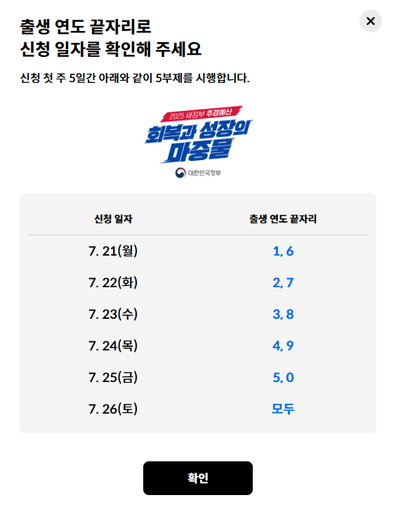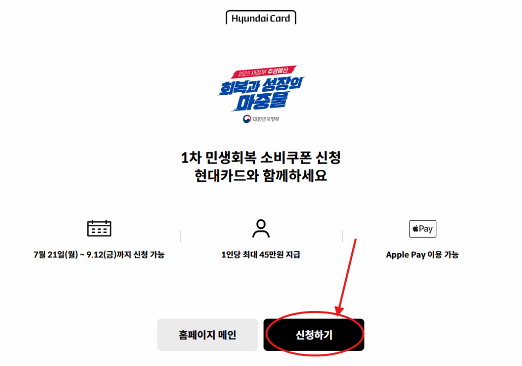 특히 현대카드 사용자라면 공식 홈페이지를 통해 간편하게 신청할 수 있습니다. 요일제 신청이 적용되는 1주차(7월 21~25일) 동안에는 출생연도 끝자리를 확인하여 해당 요일에 맞춰 신청해야 하며, 주말에는 누구나 접수할 수 있습니다.