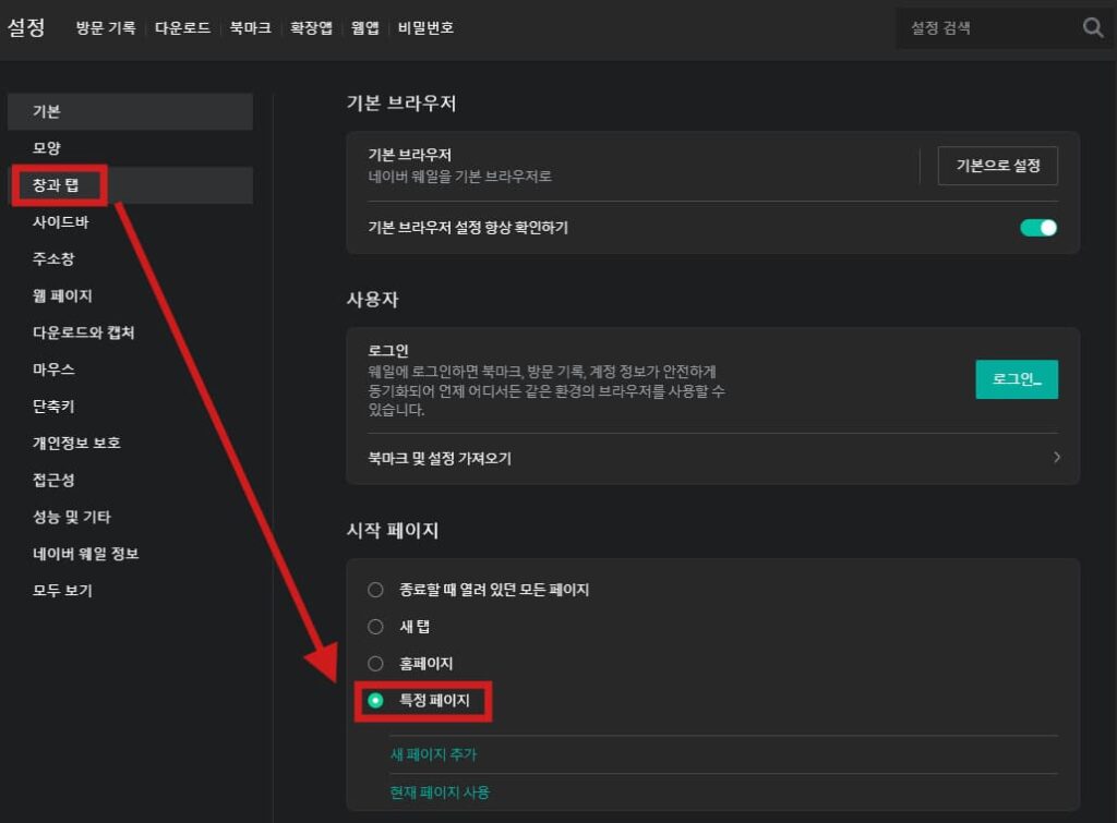 네이버 웨일에서 다음 시작페이지 설정 방법
