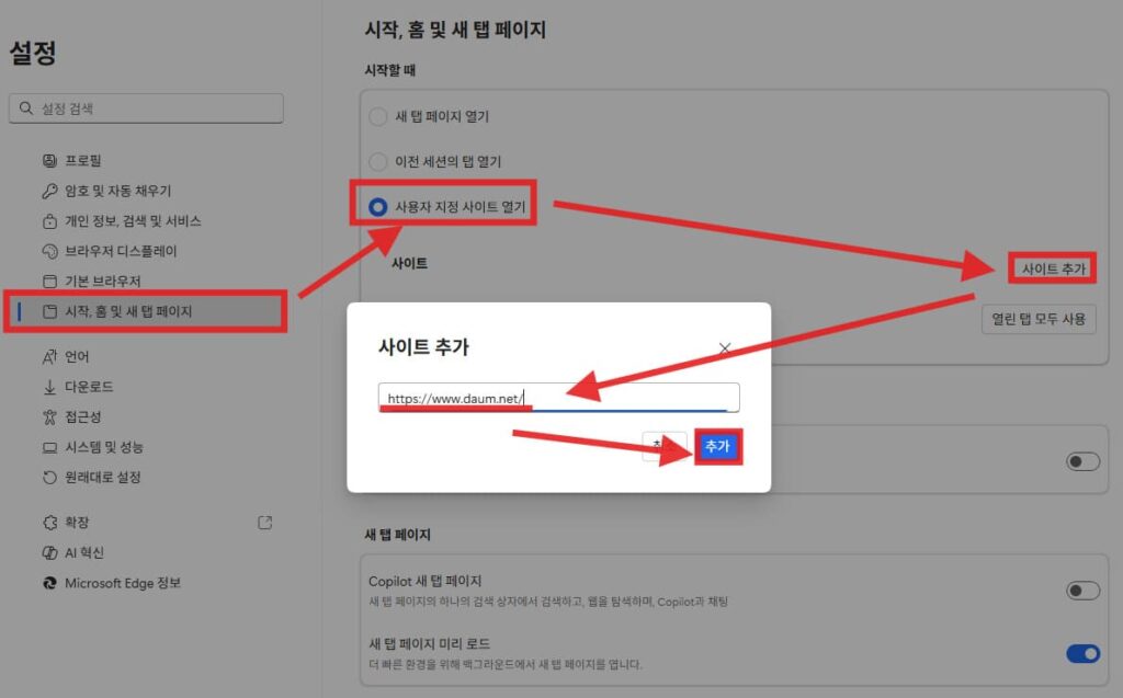 마이크로소프트 엣지에서 다음을 시작페이지로 설정하는 방법입니다.