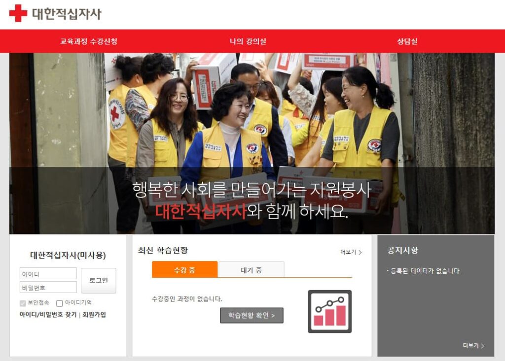 대한적십자사 사이버연수원은 적십자 봉사자 및 관련 종사자들이 현장 실무 능력과 전문성을 강화할 수 있도록 다양한 교육 과정을 제공하는 온라인 학습 시스템입니다.