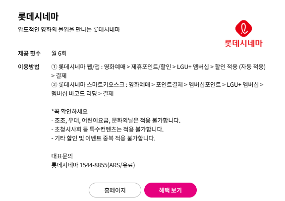 LG유플러스 고객은 U+멤버십 혜택 중 영화 할인 제휴가 한정적이나, 특정 시즌이나 이벤트 기간 중에는 롯데시네마와 연계된 할인권 또는 영화 관람권 지급 이벤트가 진행되곤 합니다.