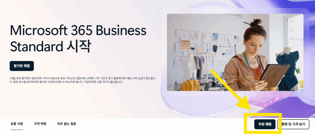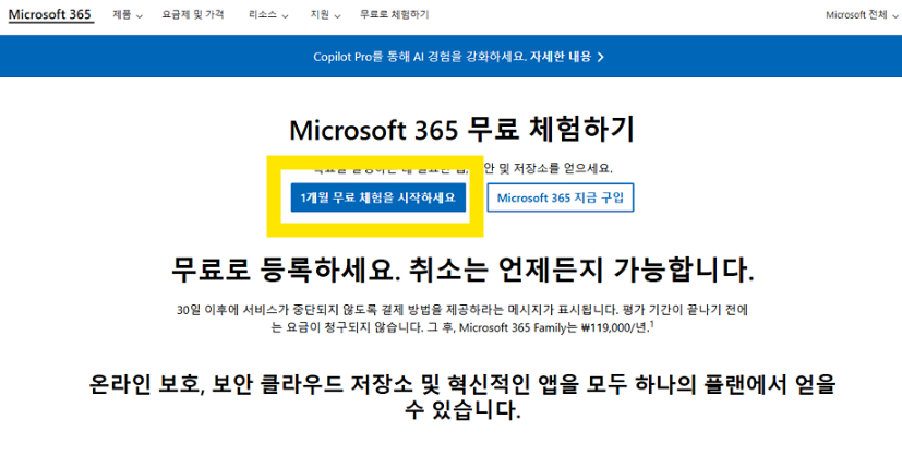 마이크로소프트 공식 사이트에 들어가면 ‘Microsoft 365 무료 체험’ 메뉴를 확인할 수 있습니다. 정품 소프트웨어를 안전하게 사용하기 위해 반드시 공식 경로를 이용하는 것이 좋습니다.