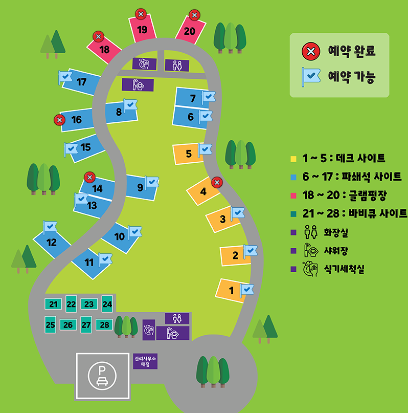 회원가입 후 로그인 상태에서 ‘예약하기’ 메뉴를 클릭하고, 원하는 시설(캠핑사이트 또는 글램핑)을 선택한 뒤 날짜와 인원, 결제 수단을 입력하면 예약이 완료됩니다. 결제 후 발급되는 예약확인서를 지참하면 현장에서 간편하게 입장할 수 있습니다.
