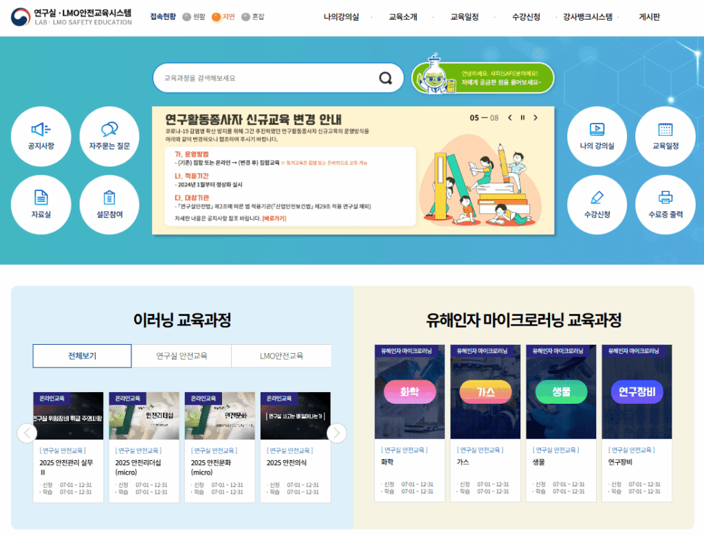 - 연구실 안전교육 및 LMO 안전교육은 법정 교육 주기(예: 연 1회 등)가 있을 수 있으므로 마감 직전에 몰리지 않도록 미리 신청하는 것이 좋습니다.